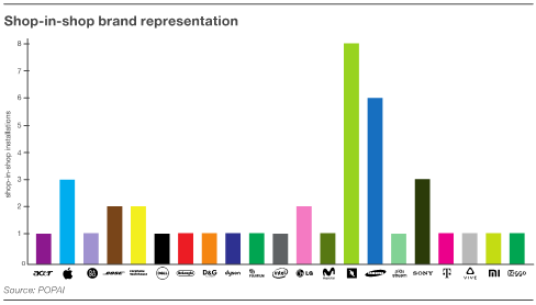 Více než třetina prodejen (35 %) využívá rovněž konceptu shop-in-shopu, nejvíce tomu tak je ve Španělsku a České republice. Mezi značky, které se tímto způsobem prezentují nejvíce, patří Nespresso, Samsung, Sony a Apple.