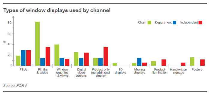 Dalšími prostředky, které se ve výlohách objevují, jsou samostatně stojící komunikační média (20 %), podstavce (17 %) nebo stolky (13 %), a to především na českém, německém a britském trhu. Naopak zřídkakdy jsou k vidění plakáty (15 %), podsvícené produkty (8 %) nebo ručně psané nápisy (5 %).