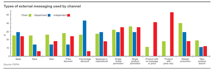 Ještě před vstupem na prodejní plochy vysílají obchody s elektronikou na zákazníky několik sdělení najednou: nezávislé prodejny průměrně 2,9 sdělení, síťové 3,5 a v obchodních centrech 3,9. Nejčastěji se taková sdělení týkají slev, ale i pouhého představení produktů s cenou nebo produktových novinek.