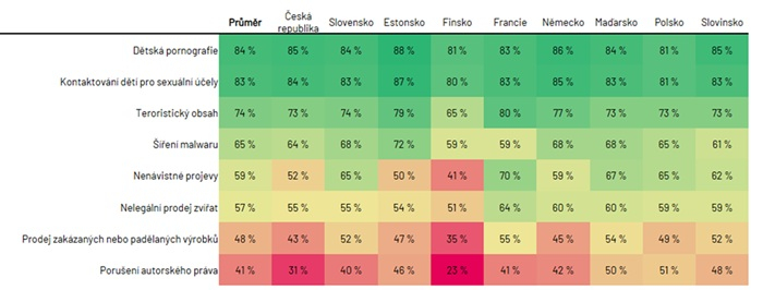 Výsledky ukazují, že Češi i občané dalších zemí nejvíce vnímají jako závažné hrozby na internetu dětskou pornografii a navazování kontaktu s dětmi za účelem zneužívání. Tyto formy nelegálního obsahu považuje za „rozhodně škodlivé“ více než 80 % respondentů. Naopak méně nebezpečné se veřejnosti jeví porušování autorských práv či prodej padělaného zboží. Zatímco v průměru 41 % Evropanů považuje porušování autorských práv za vysoce škodlivé, v Česku tento podíl klesá na pouhých 31 %. Společně s Finskem tak Česko patří mezi země, kde je digitální pirátství vnímáno nejmírněji. Podobně je tomu i u prodeje padělků, který označilo za škodlivý 43 % Čechů, oproti téměř polovině respondentů v evropském průměru.
