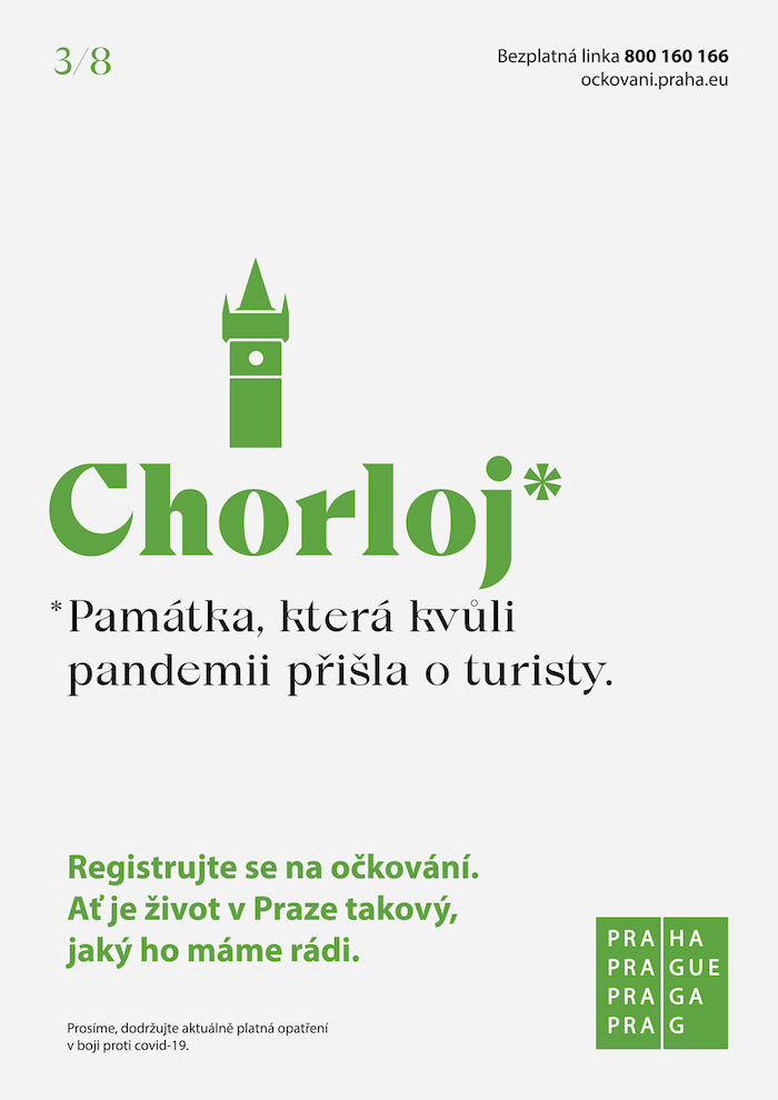 Magistrát hl. m. Praha spouští další očkovací kampaň, kterou opět zdarma připravila agentura DDB Prague. Tentokrát si hraje s názvy známých míst v hlavním městě a mění je, aby ilustrovaly, jak se život v hlavním městě během pandemie proměnil. Vinohrady se tak mění na Virohrady, Výstaviště na Výstavpříště, Orloj na Chorloj a Národní třída na Marodní třídu.