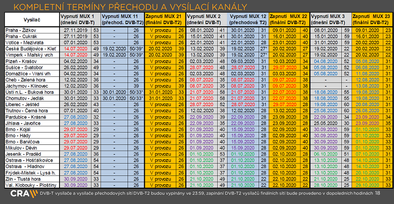 Celý přechod na DVB-T2 měl původně skončit letos v červnu, uvolněné kmitočty mají získat mobilní operátoři pro rychlé sítě 5G. Kompletní harmonogram je k dispozici na dvbt2overeno.cz, kde jsou i informace o certifikovaných přístrojích pro příjem DVB-T2 vysílání.