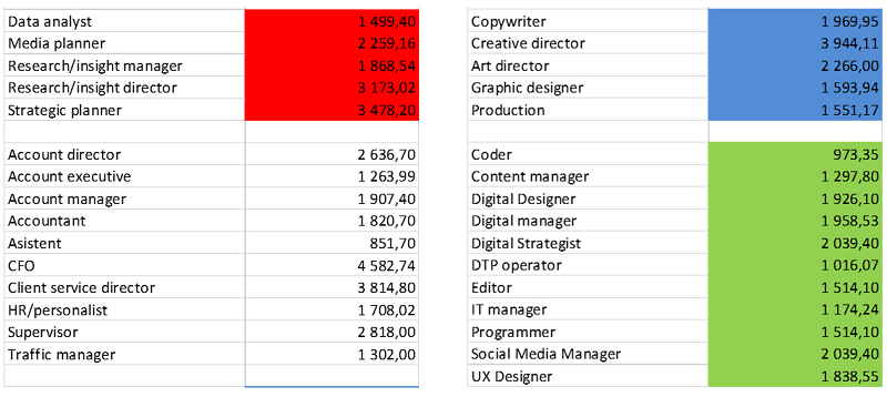 U hodinových sazeb komunikačních agentur došlo v oblasti strategického a mediálního plánování, datových analýz a managementu kampaní k růstu v průměru o dvě procenta. Sazby za kreativní a produkční zpracování kampaní a za digitální služby vzrostly o tři procenta. „U hodinových sazeb lze vypozorovat značné rozptyly. Profesionální a kvalitní služby poskytované super-seniory či zahraničními experty mají výrazně vyšší sazby než průměr udávaný na pozici. Poptávka po nich na trhu nicméně roste, výrazně je to patrné zejména v oblasti strategické a digitální komunikace,“ říká Marek Hlavica z AKA.