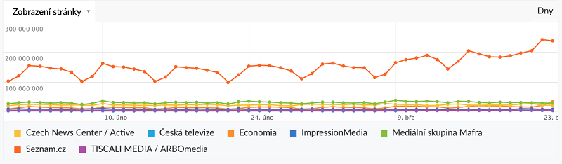 Samotného mě mrzí, že jsem se nepodíval o pár dní dřív na dostupná online data měření českého internetu, ale to, co jsem viděl, mě víc než zarazilo. Že dojde k navýšení návštěvnosti zpravodajství, se dalo očekávat. Stejně tak to, že se zvýší počet zobrazení na relaci. Ale to, že Seznam.cz vyroste v některých dnech až na téměř dvojnásobek, je velké překvapení. Ano, jsou tady i další skokani, jako Economie se svým zpravodajským webem Aktuálně. V tomto případě ale celkový dopad na trh nebude tak zásadní.