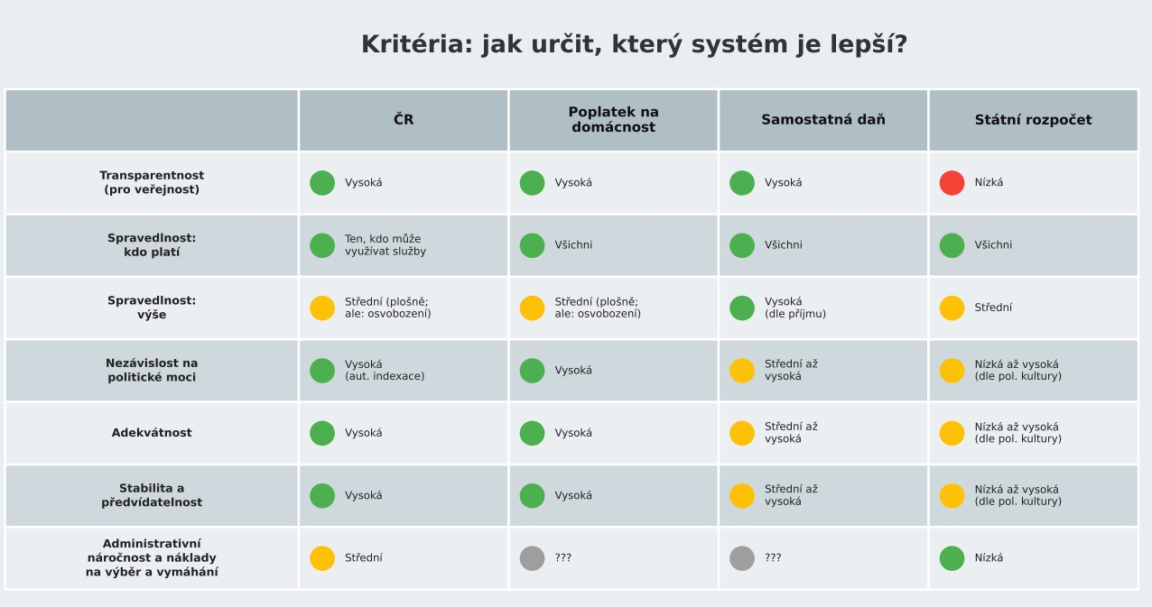 Český systém byl vloni upraven zvýšením poplatků (na 150 Kč v případě ČT a na 55 Kč v případě ČRo) a jejich rozšířením na širší okruh poplatníků. Nevykazuje masivní neochotu veřejnosti platit, ani systémový problém s politickou nezávislostí, stabilitou či předvídatelností. Diskuse o změně modelu však otevřela současná vládní koalice v programovém prohlášení, ve kterém uvedla, že chce poplatkový systém zrušit. Urbániková ale upozorňuje, že skutečné důvody pro radikální změnu zatím nejsou zřejmé. „K zásadní revizi modelu financování má smysl přistupovat pouze tehdy, pokud jsou jasně identifikovány problémy stávajícího systému a nové řešení je promyšleno tak, aby skutečně odstranilo existující nedostatky, aniž by zároveň vytvářelo nová závažná rizika,“ vysvětlila.