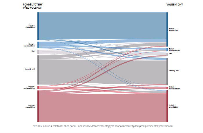 Výzkum, který představil Daniel Prokop na konferenci „Volební výzkumy a volební modely: Jaké byly volby do Poslanecké sněmovny Parlamentu České republiky 2017 a prezidentské volby 2018?”, probíhal ve třech vlnách na vzorku 1146 vždy stejných respondentů. První vlna proběhla v pondělí a úterý 22. a 23. ledna, tedy před debatou na Primě, kterou moderoval Karel Voříšek. Druhá vlna následovala hned ve středu a čtvrtek, před debatou na České televizi, jejíž moderátorkou byla Světlana Witowská. Poslední třetí vlna následovala v pátek a sobotu do 10 hodin.