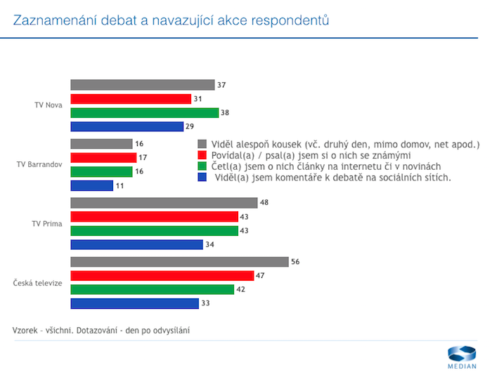 Zásah televizních debat nebyl pouze primární, tedy prostřednictvím televizní obrazovky, kdy tu na Primě sledovalo 2,2 mil. diváků, tu na České televizi 2,7 mil. diváků, ale také sekundární. Lidé si o nich četli v tisku a na sociálních sítích či se o nich bavili s přáteli. Konkrétně debatu na ČT v rozhovoru s přáteli zmínilo 47 % dotázaných, tu na Primě probralo 43 %.