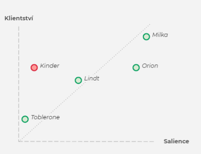 Salience (neboli to, že si značku vybavíme v nákupní situaci) silně koreluje s reálným nákupním chováním lidí – jak u Milky, tak u Orionu. Značku Kinder si ale samo od sebe vybaví jen 5 % lidí. Což není moc. Reálně si ji ale pak koupí 43 % zákazníků, stejně jako Orion. A to už vůbec není špatné.