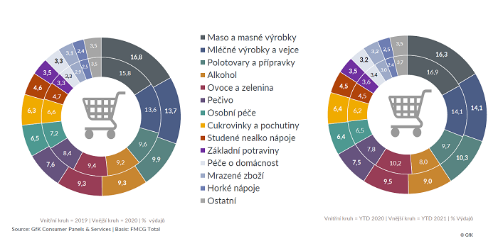 Měnící se potřeby odráží i struktura nákupního košíku. V uplynulém roce byly nejrychleji rostoucími kategoriemi v nákupech domácností základní potraviny, mražené výrobky, maso a masné výrobky, stejně jako různé polotovary a pomocníci při pečení a vaření. S výjimkou pečiva a pekárenských výrobků rostly všechny makro kategorie ve spotřebě domácností také z pohledu objemu. V první třetině letošního roku nadále posílily alkoholické nápoje, teplé nápoje a opět polotovary a mražené potraviny.