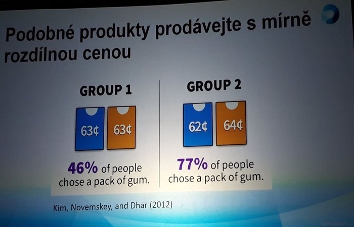 Při dalším experimentu byly nabízeny dvě různě barevná balení žvýkaček, obě za 63 centů a 46 % lidí koupilo jedno balení. Druhá možnost nabídla dvě různě barevná balení žvýkaček – jedny za 62 centů a druhé za 64 centů, kde si 77 % koupilo jedno z balení. Ve druhém bylo zákazníkům usnadněno rozhodování. V případě, že jsou dva výrobky za stejnou cenu, nemohou se rozhodnout a raději sáhnou po něčem jiném.
