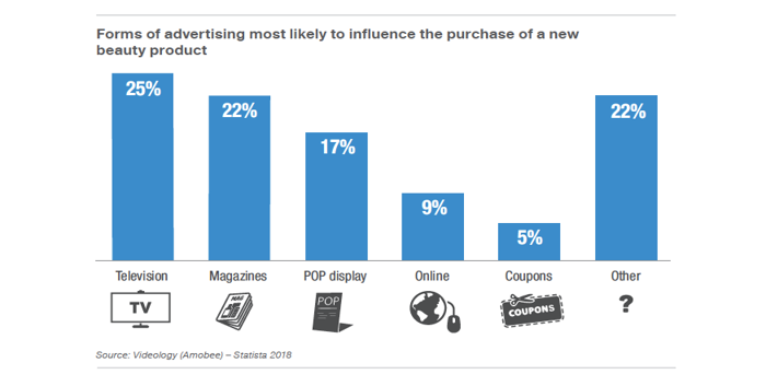 K nákupu kosmetiky nejvíce přispívá marketingová komunikace v podobě televizní reklamy (25 %), tisk (22 %) a podpora v místě prodeje (17 %).