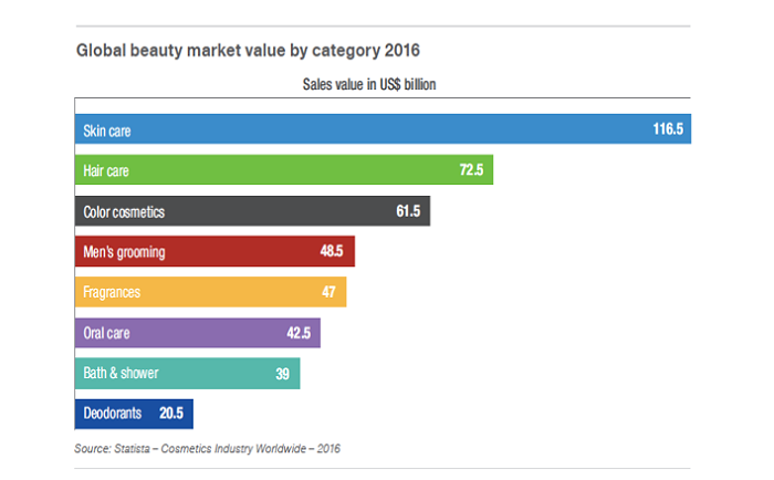 Podle dat z roku 2016 tvoří z celosvětového kosmetického trhu největší podíl péče o pleť (116,5 mld. USD), následuje vlasová péče (72,5 mld. USD), dekorativní kosmetika (61,5 mld. USD) a pánská péče (48,5 mld. USD). I tyto subkategorie se těší trvalému růstu. Péče o pleť stabilně roste od roku 2012, a tak tomu má být minimálně do roku 2024. Stejně tak, byť pomaleji roste i dekorativní kosmetika.