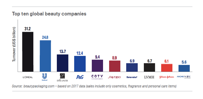 Mezi hlavní světové hráče patří po několik desetiletí stejné firmy. Největší je L’Oréal, do jejíhož portfolia patří jak masové značky L’Oréal Paris, Garnier nebo Maybelline New York, tak luxusní jako Lancôme, Giorgio Armani a Yves Saint Laurent. Dále se k top 10 řadí Unilever (Axe/Lync, Dove, Lifebuoy, Vaseline aj.), Estée Lauder, P&G (Olay, Safeguard, Secret), Coty (parfémy Adidas, Marc Jacobs, Clvin Klein aj.), Shiseido, Beiersdorf (Nivea, Eurcerin, Labello, La Prairie), LVMH (Dior, Dior Addict, Guerlain), Johnson & Johnson a Amore Pacific.