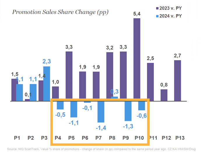 S tím, jak inflace ustupuje, se mění také strategie, na které se spotřebitelé spoléhali při zvládání cenových tlaků. Podíl prodejů podpořených akcemi stále rostl v prvním čtvrtletí, ale od druhého čtvrtletí se tento trend začal obracet. Třetí čtvrtletí tento směr potvrdilo. I přesto existuje celá řada kategorií, ve kterých se stále v promoci prodá i okolo 80 % zboží. Patří mezi ně například trvanlivé mléko, alkoholické nápoje jako hořké bylinné likéry, rum, pivo nebo také instantní káva. Nakupující u takových produktů mohou snadno považovat akční ceny za běžné, protože za ty neakční tyto produkty téměř nenakupují.