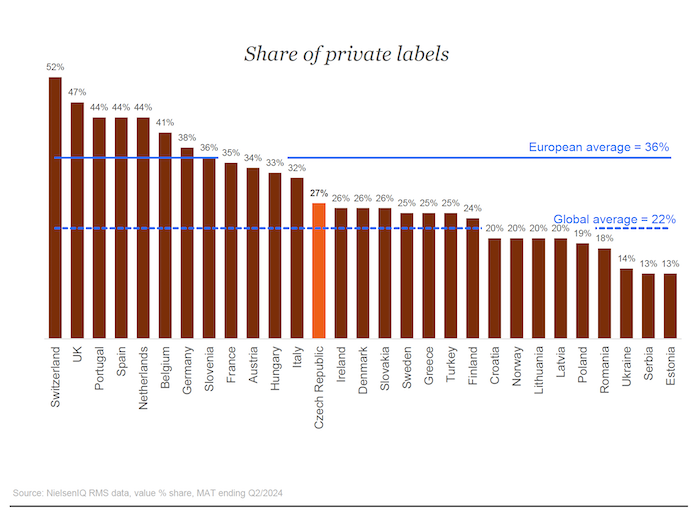 Privátní značky naopak nadále získávají v meziročním porovnání tržní podíl, a to na letošních 27 %, čímž se Česká republika dostala nad celosvětový průměr, který činí 22 %. V Evropě je průměr 36 % – vyšší podíl mají privátky například ve Švýcarsku, Velké Británii, Španělsku nebo sousedním Německu.