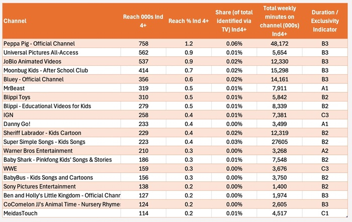 BARB zveřejnila také první žebříček 20 nejsledovanějších YouTube kanálů podle týdenního dosahu na televizorech. Dominují mu dětské kanály – na prvním místě Prasátko Pepa (viz tabulka níže), ale objevují se i velcí globální hráči nebo populární influenceři.