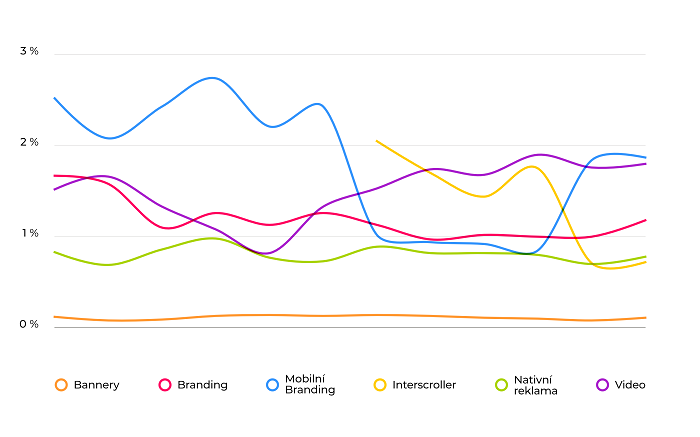 První polovina roku 2018 patřila, co se nejvyšší proklikovosti týče, mobilnímu brandingu. Ten si po tuto dobu držel stabilně hodnotu CTR nad 2 %. V červenci jej vystřídal, do RTB Indexu nově přidaný, formát interscroller. Tento největší mobilní formát si však svou vedoucí pozici udržel jen měsíc, než ho nahradila video reklama. Ta zahrnuje formáty preroll, outstream a nově přidaný bumper. V posledních dvou měsících se opět nejvíce klikalo na mobilní branding.