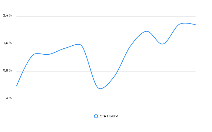 Do digitální reklamní sítě R2B2 Multiscreen spadá i bannerová reklama na televizních obrazovkách skrze červené tlačítko. Do statistik RTB Indexu jsou započítány všechny programatické HbbTV kampaně, tedy i ty, které nevyužívají interaktivního prokliku červeným tlačítkem. V průměrné míře prokliku se po většinu času tomuto typu reklamy daří více než internetovým formátům. V roce 2018 ovšem i bannerová reklama v televizi zaznamenala výraznější propad. Konkrétně se průměrné hodnoty CTR dostaly v lednu, červnu a červenci hluboce pod jedno procento. Po zbytek roku se průměrná míra prokliku pohybovala kolem 1,5 % a v posledních dvou měsících dokonce překonala dvouprocentní hranici. Ve srovnání s rokem 2017 (pozn. od května, kdy byl televizní banner zařazen do RTB Indexu) se průměrná proklikovost bannerů na televizní obrazovce propadla o 20 procent.