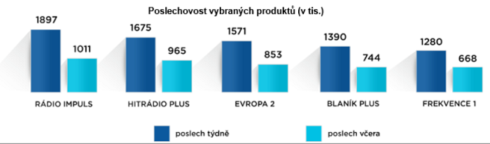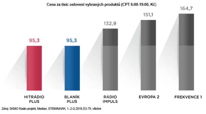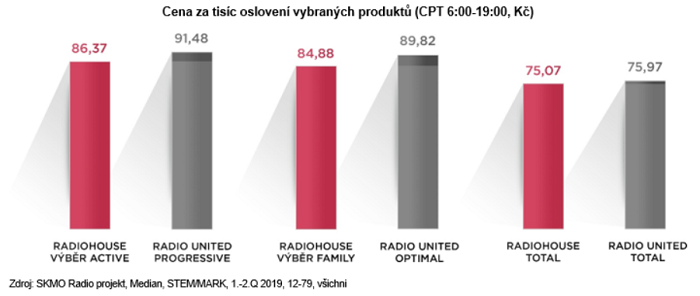 Cenové srovnání ukazuje, že CPT u hlavního produktu Radiohouse Total je pro rok 2020 nastaveno na 75 Kč, tedy cca o jednu korunu méně než v případě konkurenčního Radio United Total. Srovnání dalších produktů Radiohousu a Radio United je možné vidět na grafu níže.