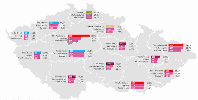 Z týdenní poslechovosti v krajích vyplývá, že Rádio Blaník je nejposlouchanější ve středních Čechách a v krajích na západě a severozápadě Čech. Impuls dosahuje nejvyšší poslechovosti v jižních Čechách, na Vysočině, v Pardubickém kraji a také v Olomouckém kraji. V Praze, na jižní, severní i východní Moravě je nejposlouchanější Radiožurnál. V Libereckém kraji vítězí Evropa 2 a v Královéhradeckém kraji Hitrádio Černá Hora.