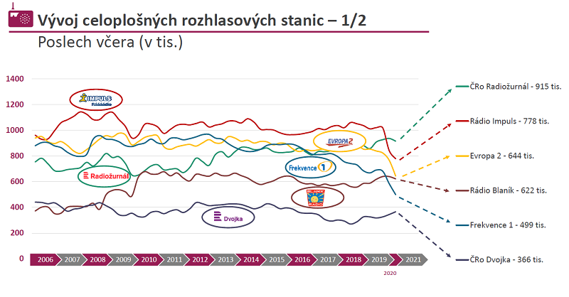 Nejposlouchanější celoplošnou rozhlasovou stanicí zůstává Radiožurnál, který ve sledovaném období denně poslouchalo 915 tisíc posluchačů, následují Rádio Impuls a Evropa 2. U všech nejposlouchanějších celoplošných stanic je viditelný pokles poslechovosti ve srovnání s obdobím druhého pololetí 2020. Nejnižší je u Radiožurnálu a u Rádia Blaník. Naopak si polepšily stanice Dvojka, ČRo Plus, ČRo Vltava a i další specializované stanice ČRo.