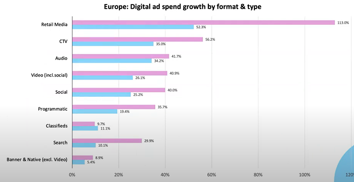 Pandemie covid-19 nejvýrazněji podpořila růst digitálních investic do retailových médií (digitální reklama, která se objevuje na webech nebo v aplikacích e-commerce hráčů, jako jsou Amazon, Walmart, eBay a další) a růst má pokračovat i v letošním roce, a to na úrovni přesahující 50 %. Predikce IAB se opírá o odhady vývoje samotných hráčů (např. Walmart předpokládá zdvojnásobení reklamních výnosů do r. 2025) a odhaduje, že reklamní investice retailových médií v Evropě se do roku 2025 více než ztrojnásobí. „Amazon je sice market lídrem, ale podíl ostatních se zvyšuje a je tu prostor i pro evropské hráče," uvedl Knapp.