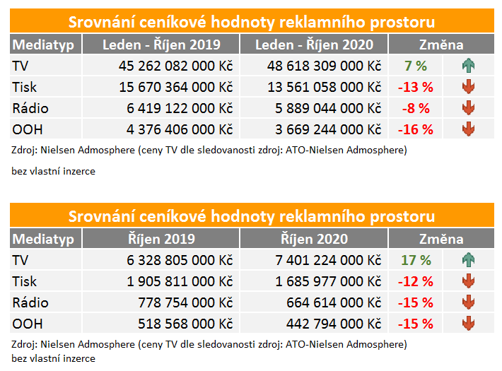 Všechny ostatní mediatypy ale v říjnu klesaly, a to dokonce dvouciferně. Nejvíce se pokles projevil v rádiové a outdoorové reklamě, a to o 15 %. O 12 % se měly v říjnu snížit investice směřované do tištěné reklamy.