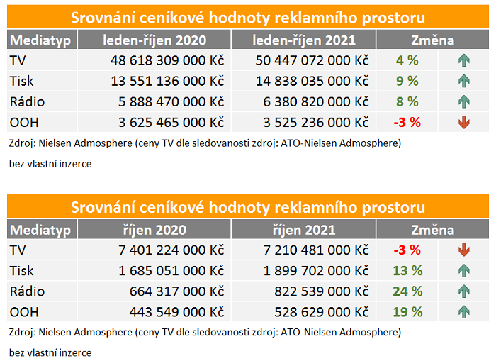 Z dat vyplývá, že za období leden až říjen 2021 se v meziročním srovnání nejlépe dařilo reklamě v tisku, v rádiích a v televizi.