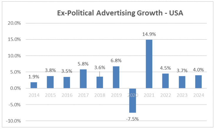 Podle predikce společnosti Magna, která reflektuje vývoj v letošním prvním čtvrtletí na americkém trhu, zaznamená reklamní trh v USA v letošním roce meziroční růst o 6,4 %. Je to o více než dva procentní body vyšší nárůst, než který Magna předpovídala loni v prosinci. Nejvyšší nárůsty jsou odhadovány pro sociální média, digitální video a vyhledávání, kterým je předpovídán dvouciferný nárůst. Digitální reklamní formáty mají pohltit až 67 % veškerých reklamních investic. Příznivější vývoj než po recesi v roce 2008 je ale také předpovídán i pro lineární média.