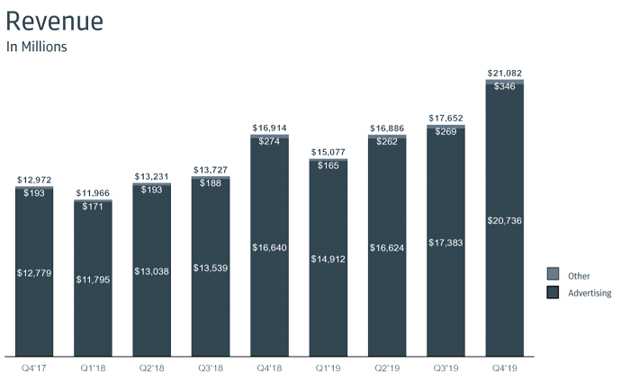 Za celý rok 2019 zisk Facebooku klesl o 16 % na 22,112 mld. USD. Reklamní tržby se ale v loňském roce zvýšily o 27 % a dosáhly 69,7 mld. USD.
