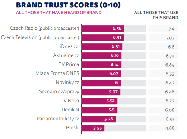 Celková důvěra v média ale není v Česku příliš velká, médiím důvěřuje 33 % internetové populace. Je to sice o dva procentní body více než v předešlém měření – a dříve pozorovaný klesající trend důvěry v média se tak podařilo zastavit –, přesto ze všech zkoumaných 38 zemí je důvěra v média v Česku nižší (30. pozice z 38).
