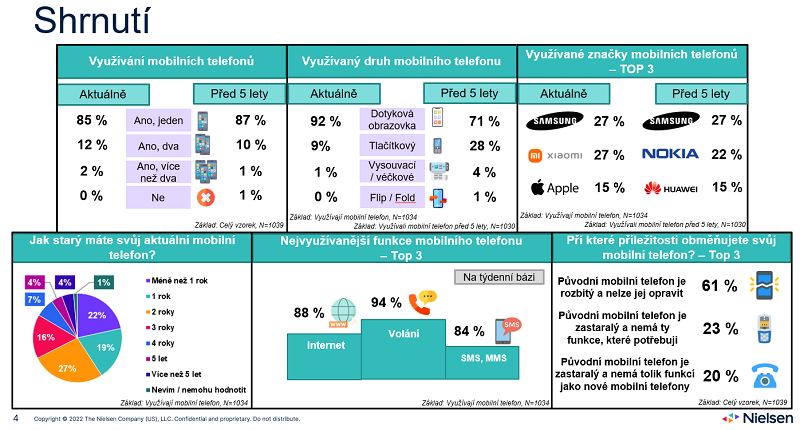 Značky Samsung a Xiaomi/Redmi jsou v současnosti nejvyužívanějšími značkami mobilních telefonů u českých uživatelů. K jejich používání se shodně přihlásilo 27 % z nich. Na třetím místě je s 15 % Apple, na čtvrtém Huawei s 11 % a na pátém Nokia s 8 %. Žádná jiná značka nepřekročila hranici 5 %. Vyplývá to z výzkumu Nielsen Admosphere pro MediaGuru.cz.