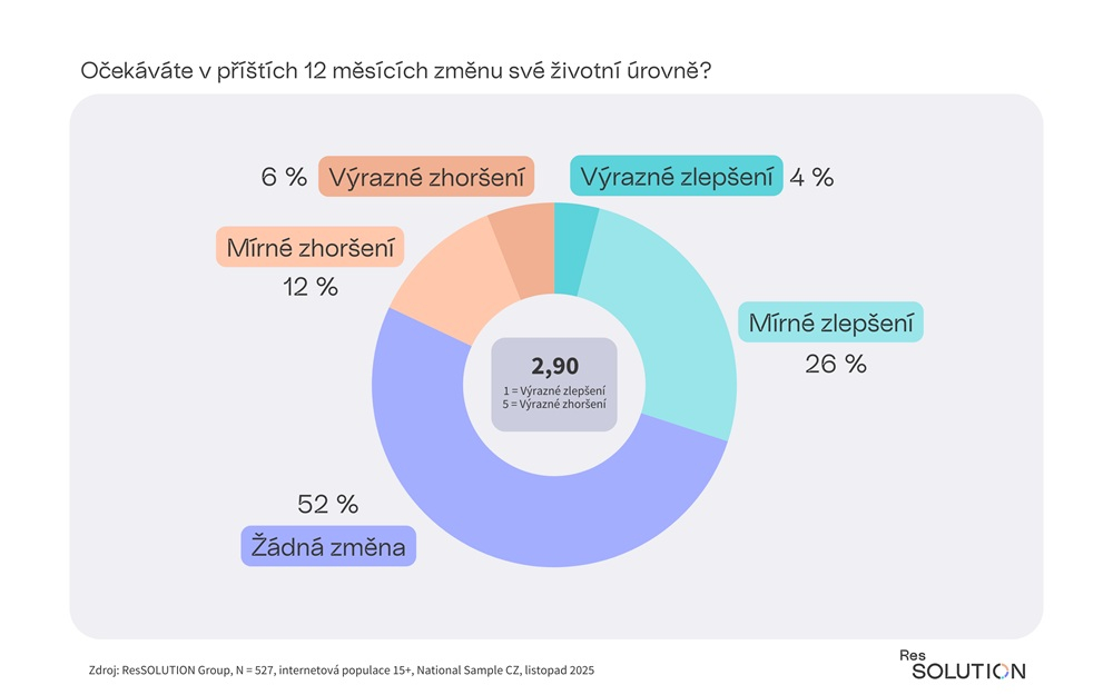 Do budoucna Češi hledí spíše opatrně. Více než polovina (52 %) neočekává v příštích dvanácti měsících žádnou změnu své životní úrovně. Zlepšení předpokládá 30 % lidí, zatímco zhoršení 18 %.