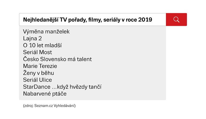 Zábavě kralovaly v roce 2019 seriály. Na prvním místě byla Výměna manželek. Lidé ale hledali i internetový seriál Lajna 2 nebo Most!.