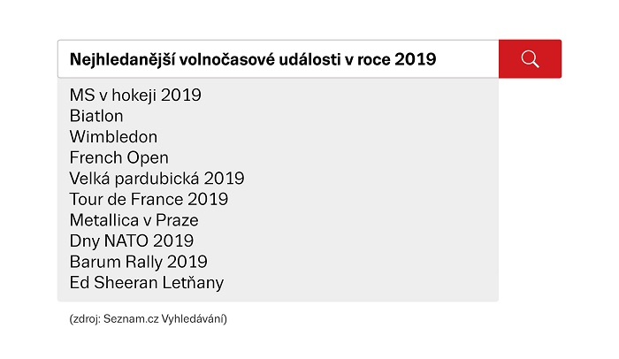 „Jako každý rok se mezi hojně hledané události dostaly i významné sportovní akce. Hlavním volnočasovým aktivitám kralovalo MS v hokeji 2019, následované biatlonem a Wimbledonem,“ říká Michal Sedláček, produktový manažer Seznam.cz Vyhledávání. Lidé se loni také hojně zajímali o koncert skupiny Metallica nebo zpěváka Eda Sheerana.