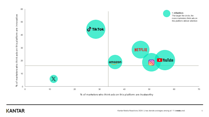 Nicméně více než tzv. bojkot zadavatelů se marketéři v poslední době shodují na tom, že síť X jednoduše není schopna doručovat nastavené reklamní cíle. Podle Jane Ostler z výzkumné agentury Kantar není tato platforma pro marketéry dnes ani důvěryhodná, ani inovativní. Jen 4 % z nich věří, že reklama na X je pro značku bezpečná a čtvrtina (26 %) plánuje své reklamní výdaje na této síti snížit, vyplývá ze studie Media Reactions.