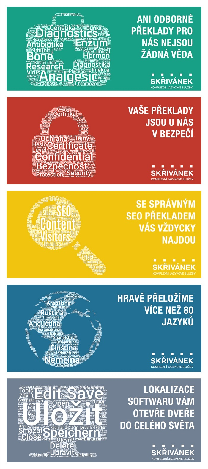 Skřivánek novým vizuálem volně navazuje na předchozí kampaň „WOR(L)D is yours“ a dlouhodobě tak poukazuje na roli slov v každodenní i obchodní komunikaci. V kampani opět hrají významnou roli slova doplňující jednotlivé oblasti překladů: odbornost, bezpečnost, komplexnost, lokalizaci a SEO.