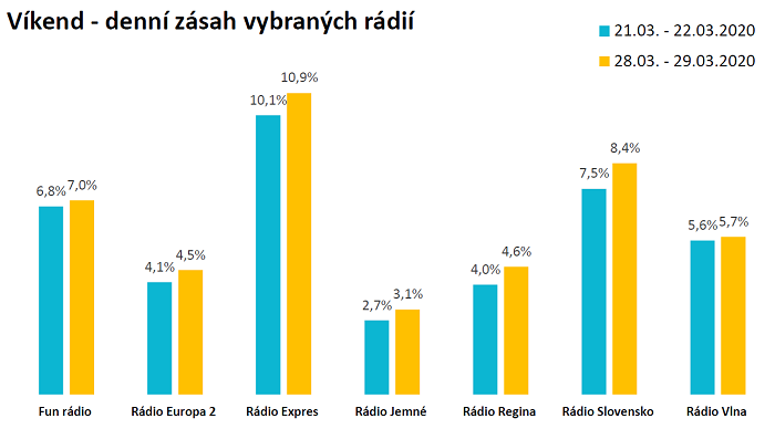 Fun rádio, Rádio Vlna, Rádo Jemné nebo Anténa Rock svůj týdenní zásah v posledním březnovém týdnu ve srovnání s týdnem od 16. března navýšily. Vyšší zásahy ukazují data také pro víkendové vysílání rozhlasových stanic, kde se nejvíce vyskočila Rádiu Expres a Rádio Slovensko.