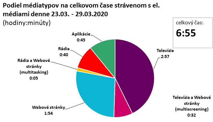 Sledovanost elektronických médií na Slovensku v období od první třetiny března významně stoupala, ukazují data adMeter od agentury Median, která působí i na slovenském trhu. Z pohledu stráveného času s elektronickými médi (TV, rádio, internet, aplikace) byl nejsilnější týden od 16. března do 22. března, kdy se celkový čas vyšplhal na 7:15 hodin. V následujícím týdnu, od 23.3. do 29.3. 2020, se sledovanost mírně snížila na 6:55 hodin, stále ale zůstává nadprůměrná. Podobně jako v Česku tak také na Slovensku byl v posledním březnovém týdnu patrný rozdíl mezi sledovaností médií ve všední den a o víkendu, kdy víkendová sledovanost byla nižší.