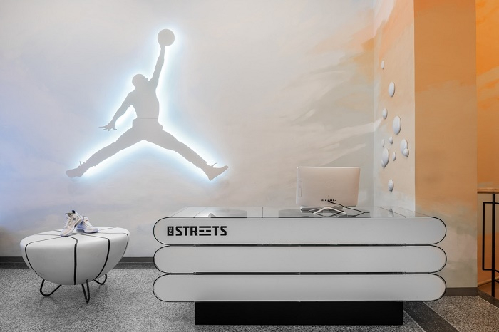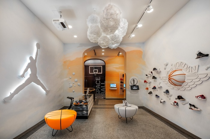 stěna s poletujícími teniskami. Uprostřed místnosti ze stěny vystupuje velké logo Wings, které je jedním ze základních symbolů značky Jordan. Dále v prodejně se sluncem prosvětlené mraky mění ve večerní oblohu zahalující zadní místnost, kde si mohou návštěvníci po uzavření skleněné příčky zastřílet na basketbalový koš. O patro níže je pak interiér stylizovaný do ulic města, kterému vládnou betonové, dřevěné a železné prvky.