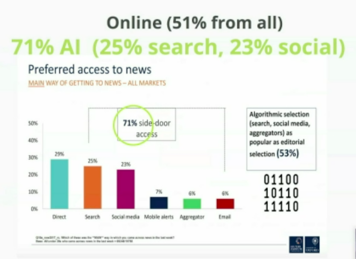 Kromě inzerce však berou sociální sítě a vyhledávači médiím i kontrolu nad přístupy. Podle průzkumu Reuters Institute sice více než polovina lidí (51 %) bere internet jako hlavní zdroj zpráv, nicméně přichází k nim většinou přes vyhledávání, sociální sítě, mobilní notifikace či agregátory. Až 71 % návštěvnosti online médií tak není tvořena přímým vstupem.