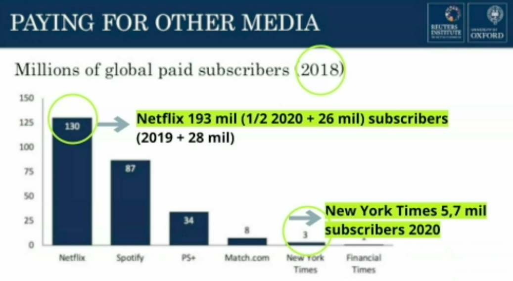Vedoucím přístupem pro média se tak podle Šmuclerové zdá být cesta digitálního předplatného a placeného obsahu. Jak ukazuje aktuální report organizace FIPP, nejvíce se na poli digitálního předplatného daří deníku The New York Times, jehož počet digitálních předplatitelů za poslední kvartál vyrostl o 14 % na celkových 5,7 milionů. The Athletic nyní registruje milion digitálních předplatitelů, tedy o 66,7 % více než v předchozím kvartále. The Atlantic jich má zatím půl milionu, Le Monde 300 tisíc a polská Gazeta Wyborcza 243 tisíc.