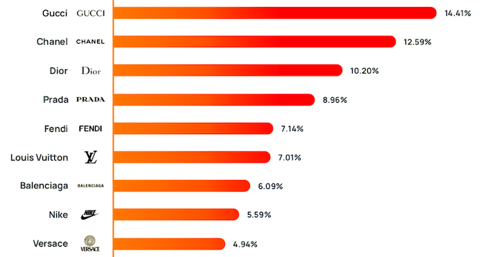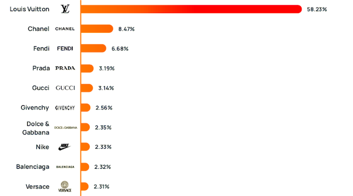 Pohledem počtu zmínek se však pořadí padělaných značek mění. Nejvíce pozornosti ze stran padělatelů se na sociálních sítích dostává značce Gucci (14,4 %), dále značkám Chanel, Dior, Prada, Fendi a až poté Louis Vuitton.