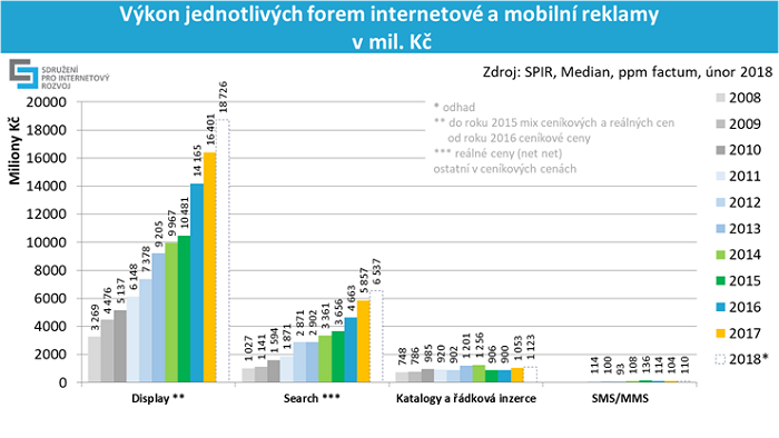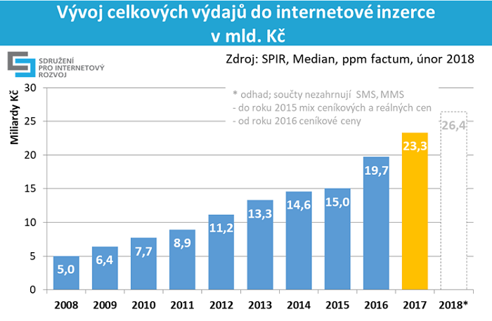 Objem internetové inzerce dosáhl v roce 2017 více než 23 miliard korun. Uvedlo to v úterý dopoledne profesní sdružení SPIR. Oproti roku 2016 jde o 18% nárůst, na kterém se v absolutních hodnotách nejvíce podílela display reklama a reklama ve vyhledávání. Údaje pocházejí z průzkumu inzertního výkonu internetové reklamy, který pro SPIR realizuje agentura Median.