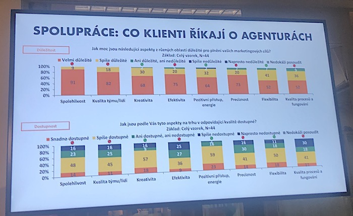 Při pohledu na jednotlivé požadavky na agentury jsou klienti přesvědčeni, že dostupné je především pozitivní přístup a energie, dále kreativita a flexibilita. Naopak požadovaná efektivita se jim spíše nedostává.