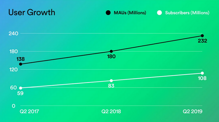 Růst předplatitelské základny vygeneroval za uplynulé čtvrtletí platformě 1,5 miliardy euro (38,5 mld. korun). Zvýšily se i příjmy z reklamy, které dosáhly hodnoty 165 milionů eur (4,2 mld. korun). Celkové tržby činily 1,67 miliardy eur (42,9 miliardy Kč) z 1,27 miliardy eur ve stejném období vloni. Byť jsou výsledky v porovnání s předchozím rokem lepší, i přesto zůstává Spotify stále ve ztrátě, a to ve výši 76 milionů eur (1,96 mld. korun). Nicméně se ji daří postupně snižovat.