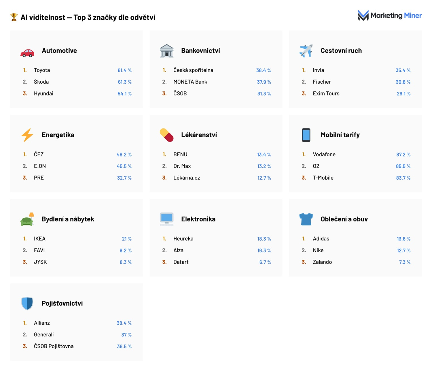 Technologická společnost Marketing Miner zveřejnila výzkum AI viditelnosti značek na českém trhu, který odhaluje výrazné rozdíly mezi jednotlivými segmenty i způsoby, jakými generativní AI nástroje vybírají doporučované značky. Studie vychází z dubna 2026 a je založena na 400 tisících měřeních napříč 100 tisíci unikátními prompty v deseti odvětvích. Sleduje odpovědi nástrojů ChatGPT, Gemini, Perplexity a Google AI Overviews.
