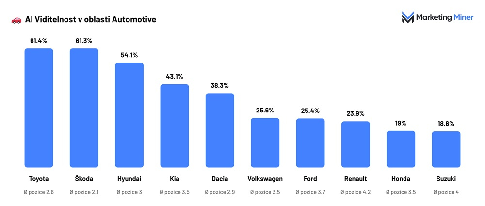 - V automobilovém segmentu zůstává rozložení stabilní. Toyota dosahuje 61,4 %, Škoda Auto 61,3 % a Hyundai Motor Company 54,1 %. AI zde opakovaně pracuje s omezeným počtem výrobců, jejichž pořadí se mírně mění napříč nástroji, ale základní struktura zůstává konzistentní.
