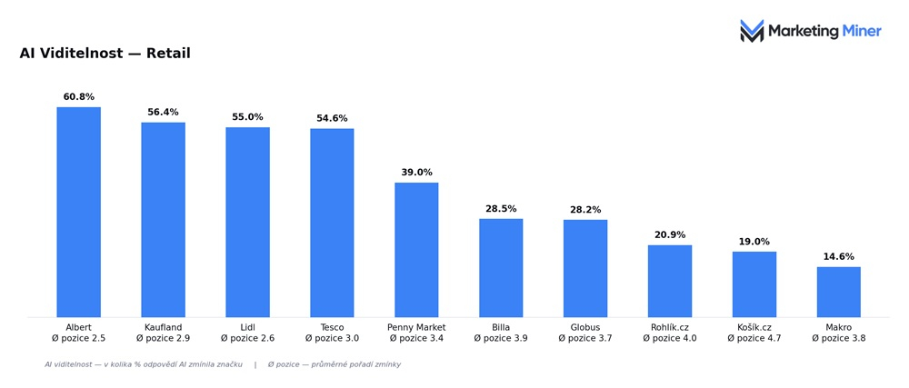 V retailovém segmentu je podle výzkumu Marketing Miner patrná vysoká koncentrace AI viditelnosti u několika velkých řetězců, zatímco online hráči výrazně zaostávají. Nejčastěji se v odpovědích generativní AI objevují Albert (60,8 %), Kaufland (56,4 %) a Lidl (55,0 %), které dlouhodobě dominují napříč nástroji ChatGPT, Gemini, Perplexity i Google AI Overviews. Těsně za nimi se drží Tesco s 54,6 %, zatímco další hráči následují s odstupemí – Penny Market dosahuje 39,0 %, Billa (28,5 %) a Globus (28,2 %).