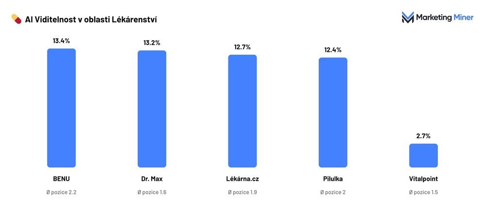 - Lékárenský segment je charakteristický vysokou závislostí na e-commerce zdrojích, které tvoří 79 % citací. Nejčastěji se objevují Benu (13,4 %), Dr. Max (13,2 %) a Lékárna.cz (12,7 %). Rozdíly mezi jednotlivými hráči jsou minimální, což naznačuje, že AI zde funguje spíše jako produktový katalog než selektivní doporučovací systém.